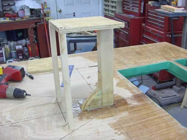 Corte una pieza de 2 x 4 de pino a la longitud especificados en los planes y pone en el orificio en el casco (línea de centro de arte) usar un montón de epoxy para esto. Cortar una placa de madera contrachapada de 3/4" para montar el motor. Ajuste las patas de tirantes de pino y taladro y tornillo en todas partes se puede. Esto evitará la vibración al mínimo usé pegamento gorila en cada articulación. Le puse epoxi lay ups todo el post para mayor resistencia.