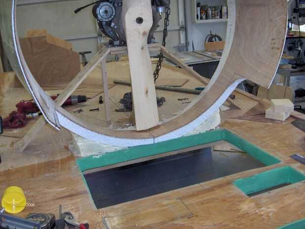 Cuelgue el apoyo sobre una varilla en un tornillo de banco para ver que es más pesado que el otro. No corta por el acortamiento de las extremidades. Sólo mantener lijar las hojas. Apoyos la mayoría están bastante cercanas cuando llegan por lo que no es una tarea sin inmutarse. Una vez que es equilibrado le dan dos capas de pintura para preservarla. Es una buena idea para pintar una banda blanca en las puntas para mayor seguridad. Por ahora la espuma es duro-a por lo que se puede cortar la parte inferior del conducto con un sable vio a cumplir con las aberturas en el casco para la elevación de aire. Ahora es un buen momento para ajuste prueba el pilar y eje del motor para asegurarse de que funciona verdadero dentro del conducto. El motor se debe empernar firmemente. Vuelta la hélice lentamente a mano. Busque por lo menos 1/8" espacio todo alrededor. Se puede ajustar colocando pequeñas cuñas bajo los soportes del motor si es necesario.