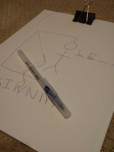 Agarrar un puñado de páginas en blanco y mantenerlos junto con una carpeta de pinza y una hoja de cartulina gruesa de robustez. Ahora ata un bolígrafo o un lápiz en un pedazo de cuerda y el lazo que a la carpeta clip un bloc sencillo que siempre tiene una pluma unida. Rápido y fácil.