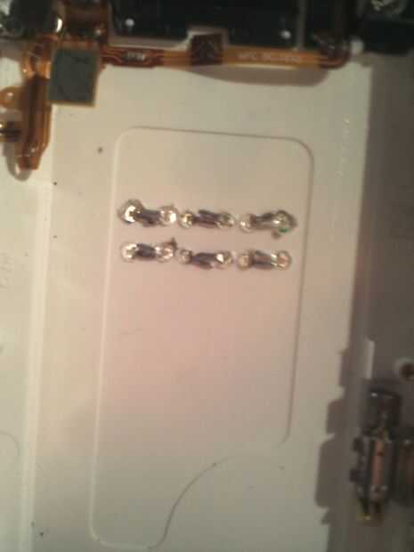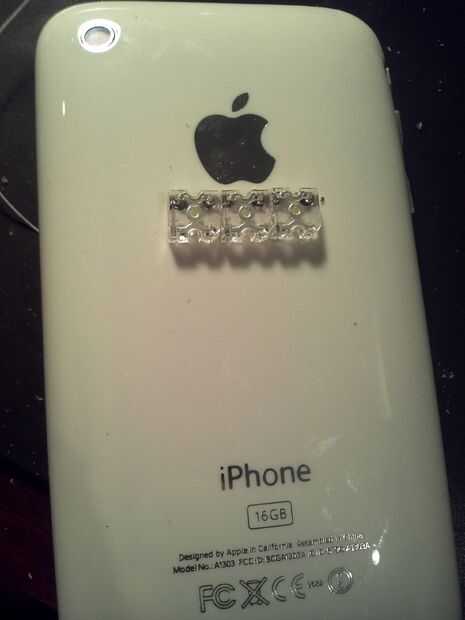 cada led tiene cuatro pernos. mira de cerca usted puede ver cómo los dos pasadores a cada lado están conectados internamente. los LED están diseñados para ejecutarse entre 3.5v y 4.0v. la batería del iphone es de 3,7 voltios por lo que esto significa que podemos encender todos los LEDs sin resistencias de cualquier funcionando todo en paralelo que significa que conectar juntas todas las conexiones negativas y todas las conexiones positivas se conectará.