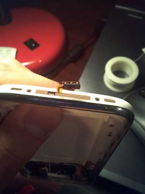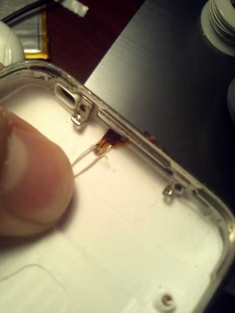 Ok, ahora que tiene dos cables conectados al conmutador, darles de comer a través del agujero donde está el conectador del muelle. Utilice un trozo de cinta aislante para mantenerlo en su lugar. luego puede poner el conjunto de altavoces conector dock en el. Debe encajar en la parte superior muy fácilmente. Si no lo hace, asegúrese de que la soldadura de las resistencias no es demasiado voluminosa como esto interferirá con el conjunto de muelle.