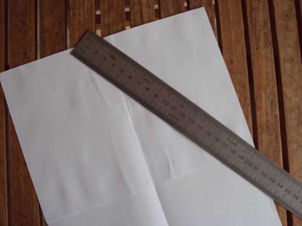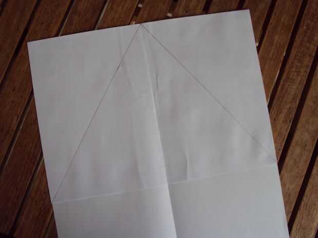 Trazar una línea recta desde el centro de la gran parte del papel a la mitad del lado pequeño del papel. Hacerlo en ambos lados. Ahora tienes algo que se parece a la segunda imagen.