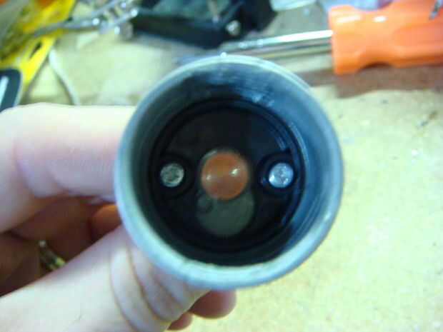 Hay dos pastillas de hilo pequeño que tendrá que limar, como que se presiona la tapa del barril en el cuerpo. Mirando hacia la tapa, hay dos tornillos que sostienen la cosa juntos. Lugar un pegote de pegamento caliente en cada cabeza de tornillo para evitar cualquier cortocircuito con lo BlinkM. Por último, clip de las dos lengüetas de metal que hicieron contacto con el bulbo.