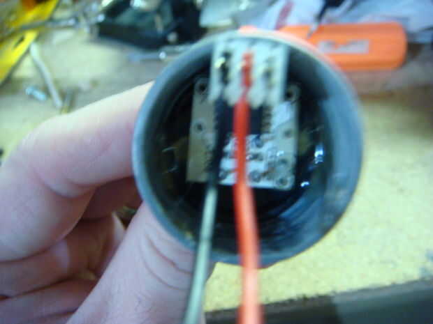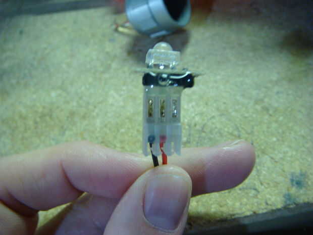 D y C. Luego conecte el conector de 2 pines cable, asegurándose de que usted tenga en cuenta las conexiones positivas y negativas (+ y - en lo BlinkM). Utilice un poco de pegamento caliente para fijar el conector al lo BLinkM. Por último, Monte lo BlinkM dentro de la tapa del barril por lo que el LED esté apuntando hacia abajo y está descansando en el área ahuecada de Dónde está el post claro. Asegurar con pegamento caliente en cada lado. Doble suavemente el conector de 2 pines hacia el centro en un ángulo aproximado de 45 grados.