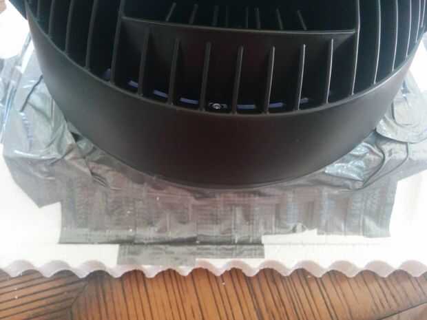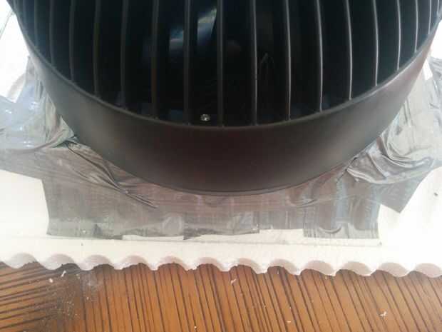 Tome el ventilador, coloque en la parte superior y luego cinta adhesiva hacia abajo y formar un sello en la tapa lo mejor posible. No vamos a ir de maravilla de la ingeniería aquí, nos dirigimos para que sientan en su lugar y tratar de no perder tanto la presión como sea posible cuando el ventilador sopla hacia el enfriador.