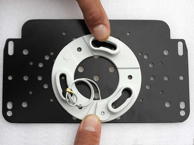 Instale el collar de cámara Axis P5534 en la cámara universal de Dotworkz placa de montaje, asegurándose para alinear correctamente y apretar firmemente las arandelas de seguridad.