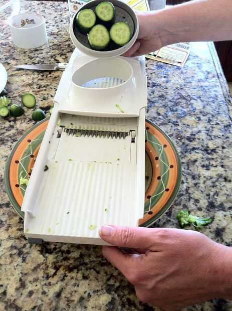 Usar su cuchillo de mandolina para cortar los pepinos en rodajas muy finas. Terminé de corte a cerca de tres que era una taza entera. Coloque las rodajas de pepino en el recipiente en que va en conserva en vinagre el pepino.