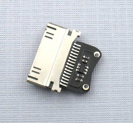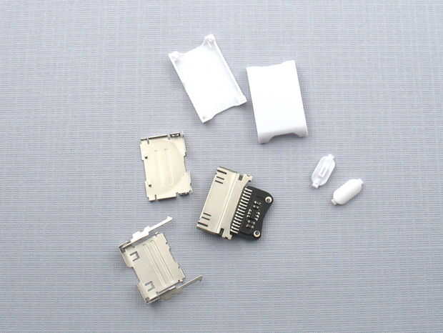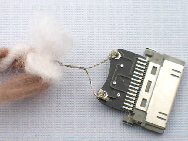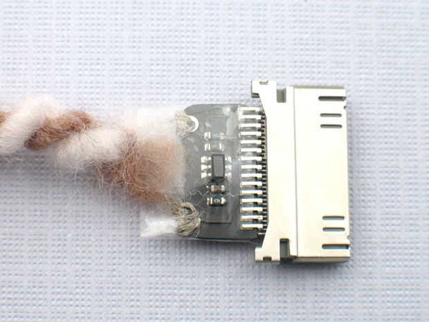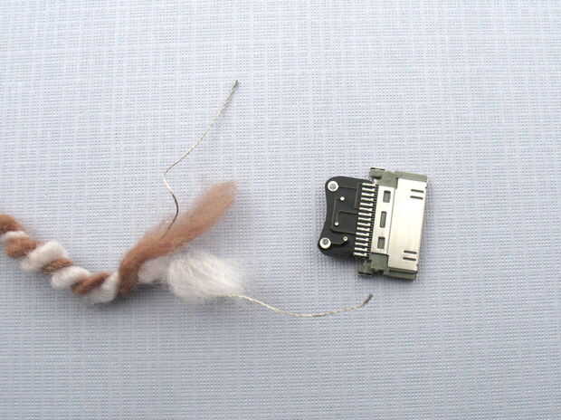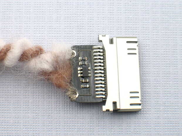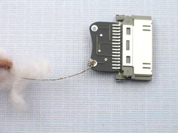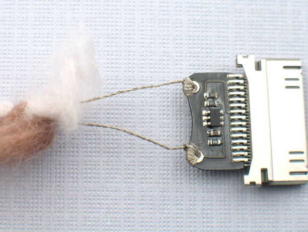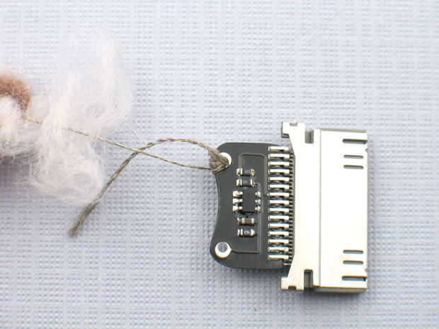 Para los curiosos, el conector dock es una pequeña con un PIC10F222 en SOT23 forma. Utiliza un pin analógico para detectar la tensión entre los dos agujeros sewable. Hay una subida de 50kOhm a la izquierda y la tierra a la derecha. Si utiliza su propio microcontrolador, simplemente proporcionar 3.7 1.5 y 0 voltios para el orificio izquierdo.