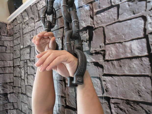 Fije sus antorchas en las paredes de la mazmorra (aquí compramos piedra papel pintado en el almacén del dólar y lanzó algunas manillas sobre la pared de las escaleras de la puerta. Apaga las luces... Mazmorra instantánea.