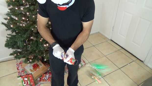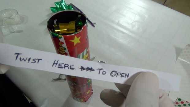 l qué vamos a hacer es vestir ese popper del partido con el embalaje de papel y tratar de pasar como un regalo. Para hacer esta trampa un poco más explosivo que estoy añadiendo algunos broches de fiesta interior. Este paso es clave para esta broma sea un éxito y que es poner una etiqueta en la parte inferior de lo popper del partido que dice que deben girar la parte inferior para abrirlo