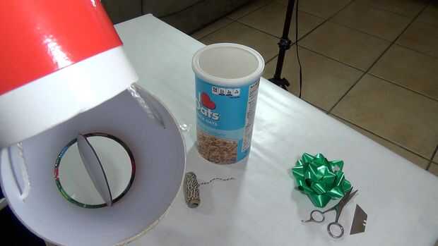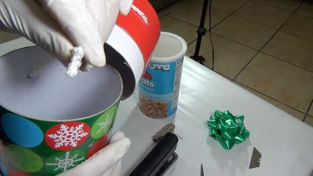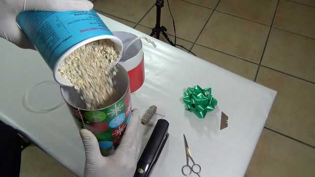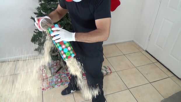 Último paso fue llenar la caja de regalo con algo que haría un gran lío y qué mejor que la avena. ¡ Mira el video de una demostración divertida de esta broma!
