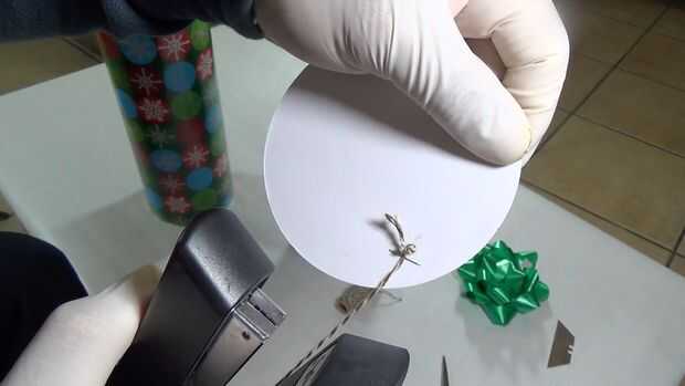Otra forma de hacer un lío similar es a golpe de armas que una caja de regalo de botella de vino, este fue perfecta para eso porque la parte superior fue atada con la cuerda un poco que también actuó como un mango. La mejor parte era que el cartón de fondo puede fácilmente pop-up así que aquí tiene lo que hice. Tengo un trozo de cuerda y ató un nudo en un extremo, que yo con grapas a la cartulina que quité.