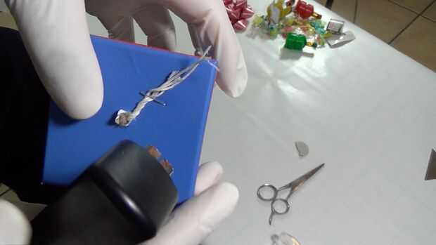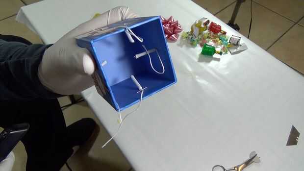 Esta próxima travesura, no ven venir. Necesitarás unos 4 petardos pequeños como estos, básicamente solo vas a quitar los fabricantes del ruido de cada uno. Grapa de uno por cada lado en una pequeña caja de regalo con las cuerdas que se pega hacia fuera. Una vez que se unen los 4. Unir las cuerdas y correr por un agujero que tiene que hacer en la tapa de la caja.
