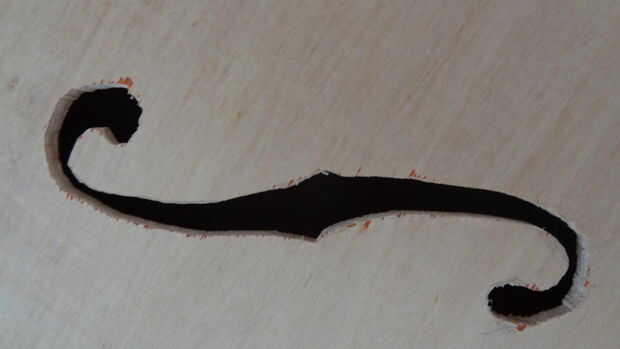6. corte dos f-agujeros en la placa frontal usando un taladro eléctrico y una sierra caladora de mano.
