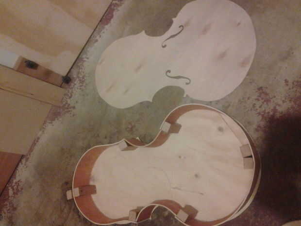 Aquí puede ver el proceso por el que los combates estaban pegados abajo. Las placas de cara luego se colocaron posteriormente en la parte superior, seguida por el f-agujeros de perforación.