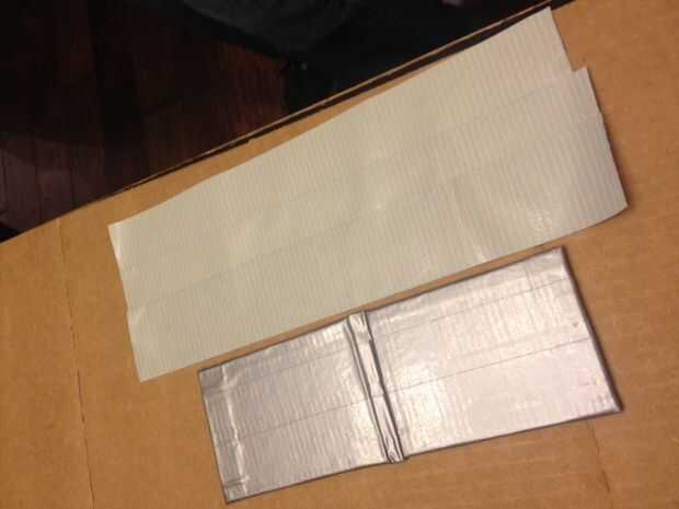 Los ponen a lo largo sobre la otra por lo que el rectángulo creado es aproximadamente una pulgada más alta que su billetera. Debe tener un pedazo largo de cinta que es cerca de 4 pulgadas de altura y 10,5 pulgadas de largo.