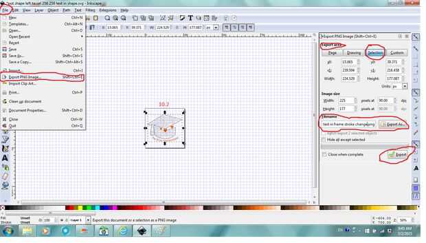 También es importante exportar el diseño a utilizar en otros programas o en la web que no siempre es compatible con archivo SVG. Para exportar tu diseño, elegir su diseño, haga clic en archivoy luego Exportar PNG imagen, en el cuadro de diálogo, eligen selección bajo área de la exportación (página y dibujo puede incluir el espacio que rodea el diseño creo que. Usted puede jugar con las opciones para ver), asegúrese de que bajo el nombre de archivo a la izquierda de exportación como lo es en la carpeta y nombre de archivo que desee y haga clic en exportar (10.2).