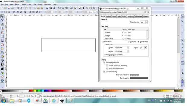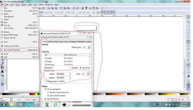 Para un texto único logotipo "Cómo 2 diseño de un logotipo" en él, creo que 400 por 100 parece ir bien. Para hacerlo en Inkscape, haga clic en archivo, encontrar propiedades del documento en el cuadro de diálogo de archivo, haga clic en propiedades del documento, en documentan de ventana/cuadro de diálogo Propiedades, en la pestaña de la Página , en la sección tamaño de encargo , definir unidades de px, colocan el cursor al final de las entradas Withdth y altura, utilizan retroceso, eliminar los valores por defecto y entrar 400 para Withdth y 100 de altura, entrar después de cada entrada. Inkscape añade automáticamente los puntos decimales después de la entrada manual. Asegúrese de que en la sección de la pantalla , Mostrar borde de página se comprueba.