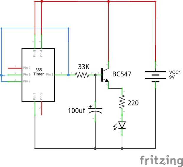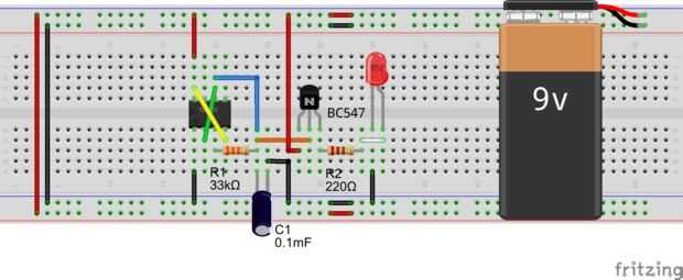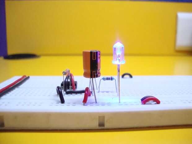 Instrucciones: Hacer todas las conexiones en el esquema anterior. Al poner en marcha el circuito, el led se descoloraría apagado entonces se descolora en y se repetirá hasta que la apague. Usted puede tratar de diferentes colores led para producir mejores efectos.