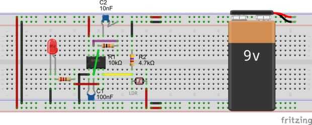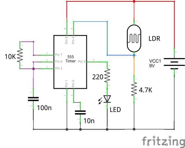 Descripción: Como se explicó antes, ldr es un dispositivo que le da cierta resistencia dependiendo de la luz que incide en él. Así que este circuito hace uso de y ldr para encender un led cuando recibe una alta cantidad de luz que incide sobre él. Un ldr ofrece una baja resistencia al recibir más luz para que el temporizador 555 se activa cuando la luz incide sobre la ldr y la salida se convierte en alta enciende el led. La salida es baja cuando la luz no está cayendo en él.