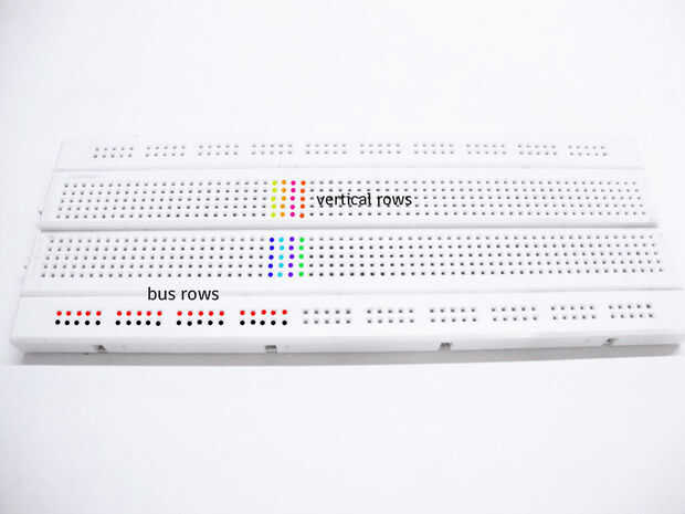 Filas verticales son otro tipo de filas donde la mayoría de los componentes electrónicos está conectada. Hay un boquete grande en medio de la placa donde se rompe la conexión entre las filas verticales. Este lugar es principalmente circuitos integrados (ics). Puesto que la conexión se rompe aquí, cada fila vertical se conecta a su respectivo pin del ic donde se añaden componentes. Filas verticales están conectadas a las filas de autobuses donde se necesita energía.