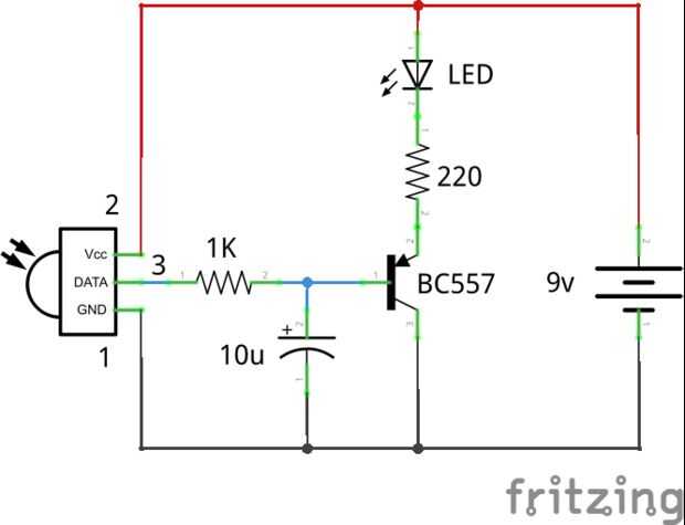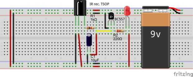Nota: Utilice una batería de 6v en lugar de un 9v como TSOP puede manejar voltajes hasta 6v solamente. Dándole un voltaje más alto puede dañar sin embargo todavía funciona con él. También utilizar un 470 ohm en lugar de 220 ohmios conectado al LED para obtener mejores resultados.