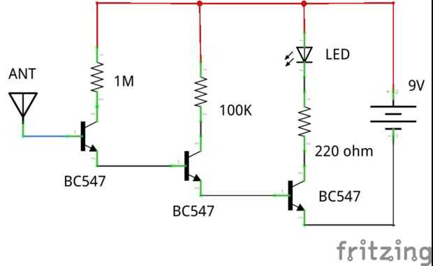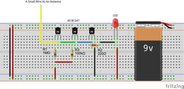 Instrucciones: Conecte todo como se muestra en el layout sobre. Mira la imagen de arriba para el pinout del bc547. Extraer un trozo de alambre de la base del tercer transistor que actúa como una antena para detectar cargas. Después de completar todo, encenderlo y poner su mano cerca de la antena. El led se iluminará débilmente. Ahora toque el dedo a la antena. Esta vez el led se iluminará brillantemente.