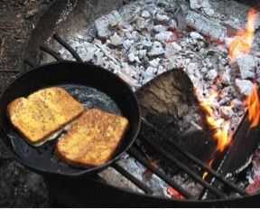 Mezcla de huevo y canela en un tazón y tapa o inmersión pan con la mezcla. Coloque pan en una sartén con mantequilla sobre la fogata o del campamento estufa y freír hasta que estén doradas. Cubrir con azúcar en polvo y jarabe de arce. Considerar el aderezo con una cucharada de frutas enlatadas o mixtos.