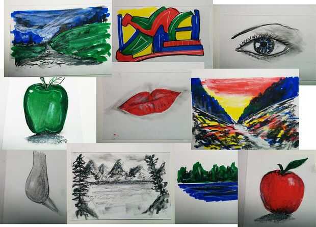 Los temas que elegí fueron las manzanas, los ojos y paisaje que todos se han hecho con los elementos de dibujos que te mostré anteriormente. Pueden experimentar aquí y dibujar lo que quieras, simplemente elegí lo que me gustaba dibujar. Incluso podría dibujar los resúmenes como lo hice aquí.