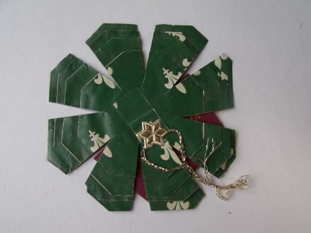 papel de regalo verde; dos plazas de cada 6 cm, 7,3 cm, 8,7, 10 cm y dos tiras pequeñas