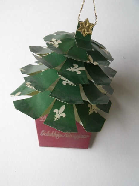 Coloque una pequeña tira de papel a la parte superior con un lazo de cuerda y algunas estrellas para decorar. Fije una misma tira de pare en la parte inferior y pegar una planta base en cada lado. El peso de la plantbase debería ser suficiente para expandir el árbol.