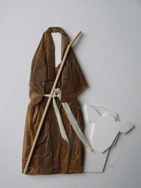 Vestido del ser humano con dos rectángulos de papel de seda (dibujado en el esquema). Pegar los bordes con el cuerpo, pero deje espacio en las caderas para que la capa puede moverse un poco.