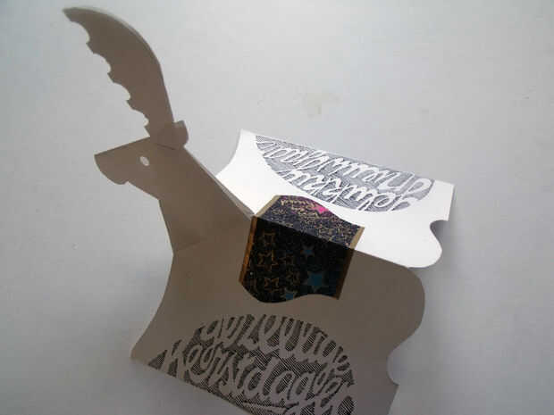 Hacer la tarjeta de papel fuerte (cartulina de Marfil). Dibuje la curva de las patas. Escribí el mensaje, guardó las letras blancas y fraguó el espacio alrededor. Corte la silla de papel y pegamento en.