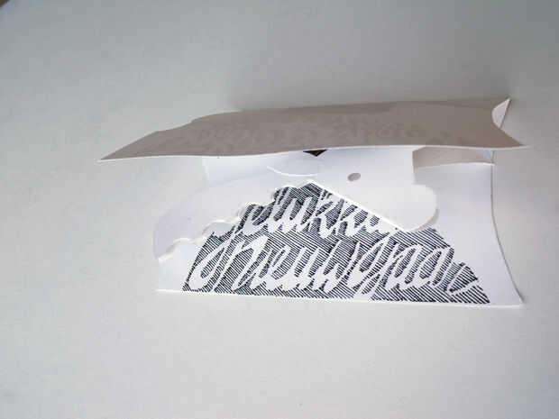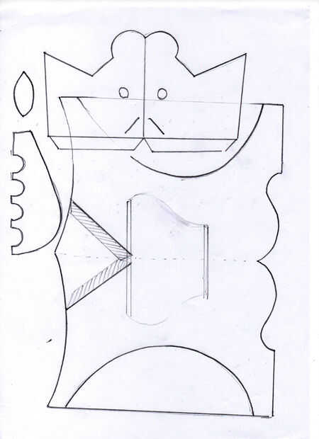 Doblar el borde adhesivo en el cuello interior y colóquelo en el cuerpo. Ver la marca en el dibujo. Gire a la tarjeta de adentro hacia afuera y asegúrese de que la cabeza desaparece completamente en la tarjeta. Si es necesario ajustar la colocación de la cabeza.