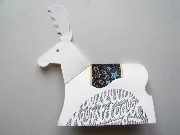 Imprimir el dibujo dos veces (PDF si eres pro). Corte el cardshape de la primera impresión. Corte la forma cabeza, cornamenta, oído y silla de montar de la segunda impresión