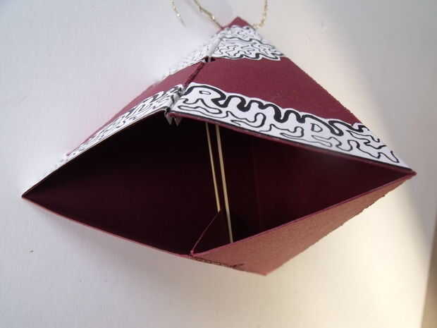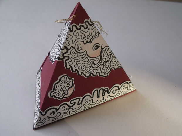 Un cuadrado de cartulina con elástico oculto aparece como un tetrahederon, decorada como santa claus.