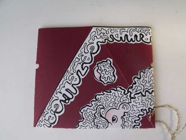 perforar cuatro agujeros en el borde de los bordes del pegado. Unir los bordes, pero no para el cuerpo de la santa. Corte la tira de elástico abierta colócala en los orificios sobre los bordes encolados. Haga un nudo en los extremos de la venda de elástico. Mover el nudo dentro del cuerpo. Presionar el cuerpo plano y poner en un sobre.