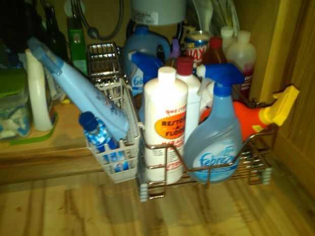 Canasta de cubiertos lavavajillas: ¿Conseguir a un nuevo lavavajillas? No tirar esa vieja canastilla. Utiliza nuestro y lo colgó el bajo fregadero de tire rack. Vino con una cesta pequeña de cromo que colgaba en el lado ya, pero había espacio para más. (Ver foto)