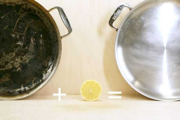 Para quitar el quemado en el alimento de los potes de acero inoxidable, llene la olla con suficiente agua para cubrir la zona carbonizada, añadir la mitad de un limón (incluyendo la cáscara) y hervir! Los pedacitos quemados deben salir en trozos fácil con un utensilio de madera o con una esponja no abrasiva matorrales.