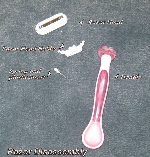 ¿Cómo puede tener una maquinilla de afeitar tan muchas aplicaciones? Desmonta. Esto requirió ningunas herramientas o fuerza super humana. Con un poco de tirando y apretando y moviendo en la parte inferior de la cabeza de la maquinilla de afeitar que se conecta, apareció justo. Entonces con un poco de tirar la parte que conecta la cabeza de la maquinilla de afeitar de la manija, se aflojará. La última parte para sacar es la primavera. (Esto es técnicamente dos partes porque hay un pedazo de plástico dentro de la primavera, pero nosotros lo llamamos una pieza) Esto que sólo puede extraer sin ningún problema.