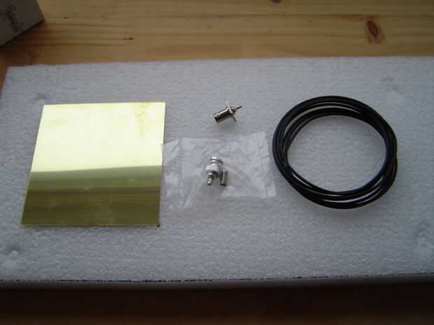Una latón de 12x12cm, chapa de cobre o estañado, un conector BNC de chasis, un conector de cable BNC, 35mm espesor PE o espuma de poliestireno (también puede ser más grueso) y algunos 1.5mm2 solo alambre de la base. Este material se utiliza en los países bajos en 220V en el cableado de la casa.