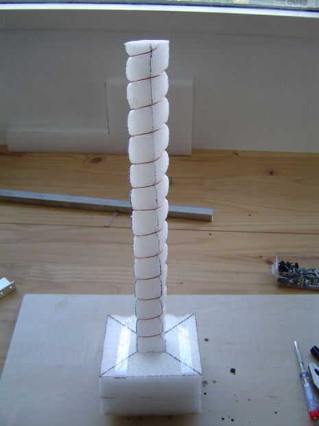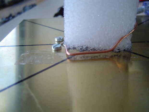 Cuando se suelda el cable de antena a la connetor, nosotros podemos bajar las plazas sobre la viga. Esto mantendrá la viga vertical. Como último paso, las plazas se fijan a la placa con un poco de cinta.