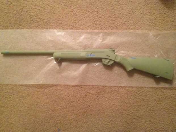 dejo mi escopeta sentarse para por lo menos unas horas al sol en un día de baja humedad antes de aplicar mis primeros patrones. Lugar estas pequeñas tiras de algunos lo que al azar, pero solo dos a cada lado. Esto será más que nada dar a una especie de mezcla de los otros tres colores.