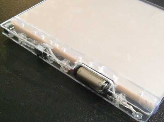 Utilizando binder clips todo alrededor tres aristas, empotrar la portada, contraportada y páginas. Usando un 1/16" pedacito de taladro, perfore todo el camino a través de la columna como se muestra a continuación, asegurándose de no poner agujeros directamente en frente de donde el LED va a ser brillante en las páginas.