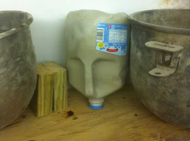 Después de la leche jarra se llena con concreto, tapa y luego Sacúdalo para ayudar a mover el hormigón en el mango de la jarra. Después de todas las partes de la jarra se llenan con concreto, sólo Dale la vuelta y tenerlo parado boca abajo para el próximo par de días, como se muestra en la figura 6, para permitir que el concreto se endurezca.