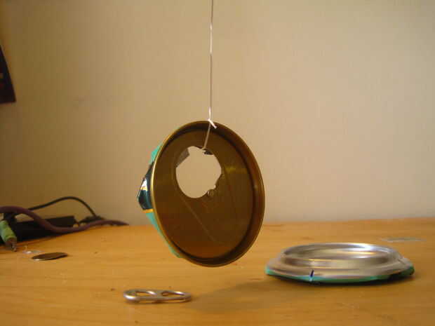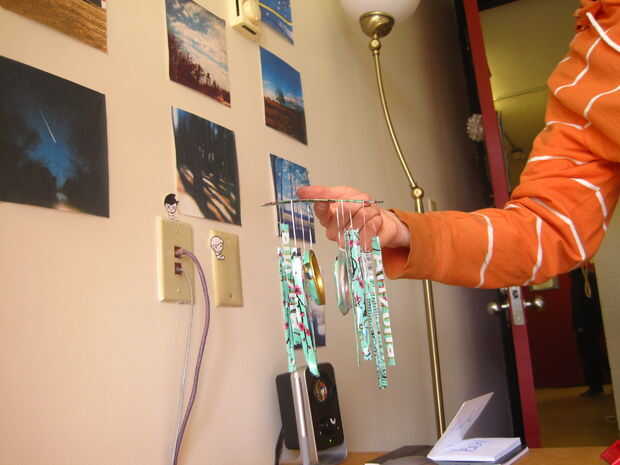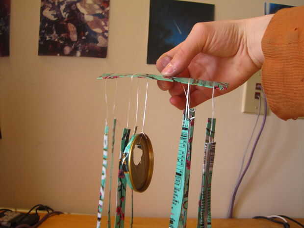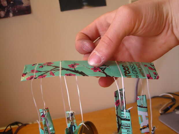 Ate la cuerda a uno de los extremos y serpiente para arriba a través de uno de los agujeros en la tira grande. Ahora serpiente hacia abajo a través de otro.