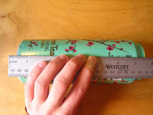 En el té verde puede que sean algunos elementos gráficos que usted puede alinear para guesstimate los cortes, y para los demás, sólo dibuja dos verticales líneas un poco más de dos pulgadas aparte en la lata y revisa el último cuadro para la referencia.
