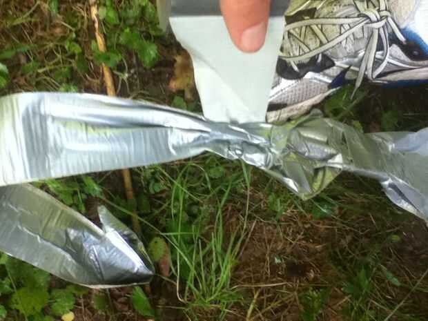 Para crear la cuerda Envuelva cinta adhesiva a partir de la intersección. Enrolle hacia arriba hacia los extremos más cercanos alrededor de la franja de 1ft para que aproximadamente la mitad de cada abrigo está en la parte superior el último abrigo. Continúe esto hasta el final y repetir al menos 3 veces. Es importante repetir este proceso porque algo agudo podría cortar a través de otra manera. Repita en el otro lado de la hamaca.