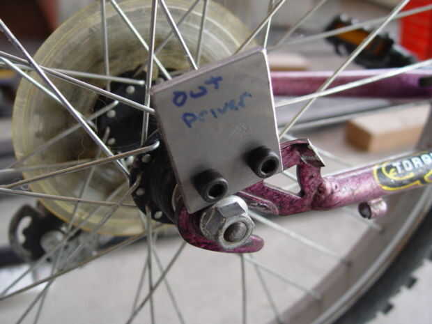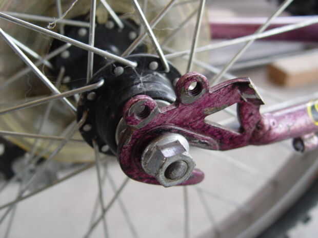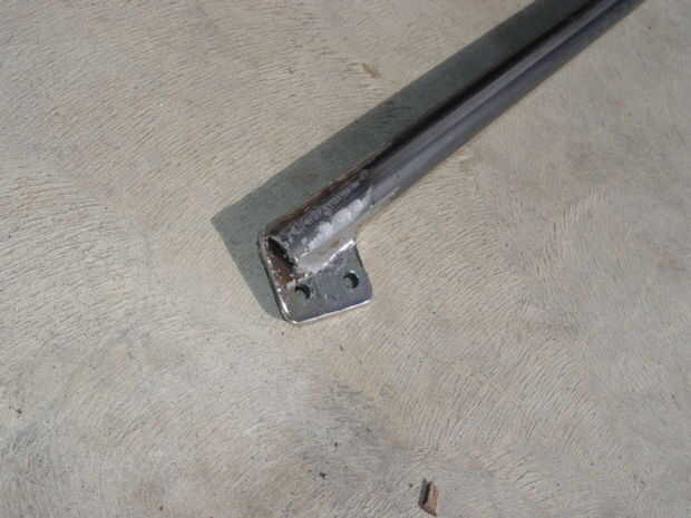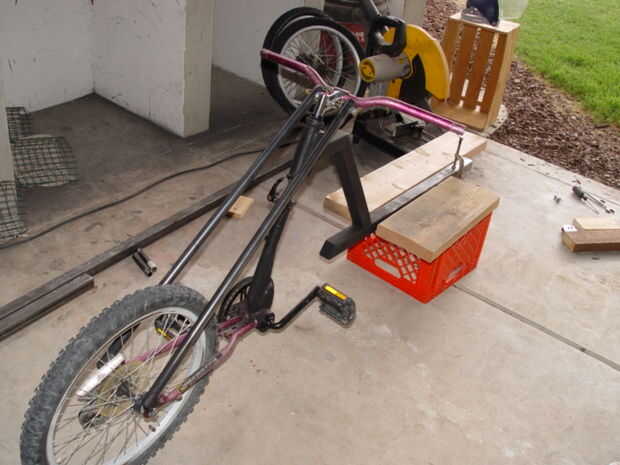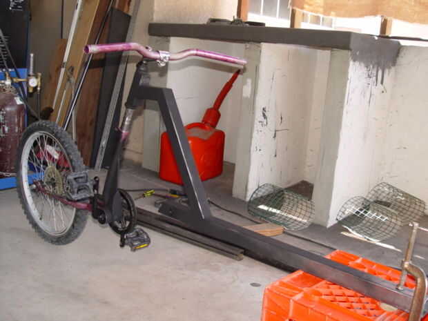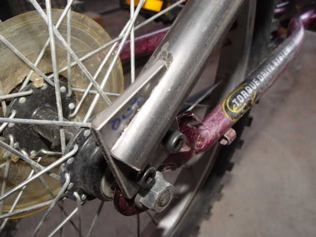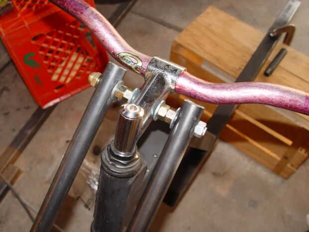 La horquilla delantera se une a los agujeros existentes de la susceptible. (Foto 2) Corte un 1 ½ "x 2" pieza de acción plana 3/16, perfore orificios coincidan con los puntos de montaje y tornillo de la acción plana de la gota hacia fuera. (Foto 3) Corte una abertura en el extremo de una sección de 3' de tubo de 1" de negro y colóquelo sobre la acción plana. (Foto 4) Perfore un agujero de 3/8" a través de la espiga de la dirección. (Foto 5) Colocar el vástago en el tubo de dirección. Alinee el extremo superior del tubo negro con este agujero en el vástago y luego tachuela Suelde la parte inferior de la pipa de negro a la lengüeta de montaje plano stock. Retire el tubo negro y acabado de las lengüetas de montaje de la soldadura. Corte cualquier exceso porciones de la acción plana de 3/16. (Foto 6)