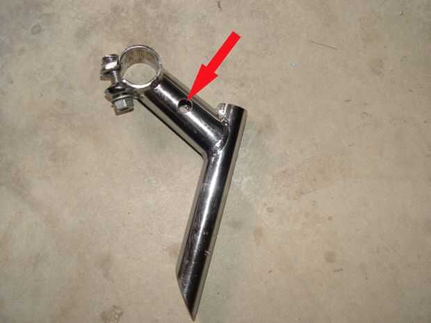 Coloque el extremo inferior del tubo negro de la caída hacia fuera y luego perfore un orificio de 3/8" en el extremo superior de la pipa de negro para que coincida con el agujero el vástago de dirección. Utilice un tornillo o varilla roscada para fijar el extremo superior del tubo negro al vástago de la dirección. (Foto 7) La horquilla delantera está ahora completa. (Foto 8)